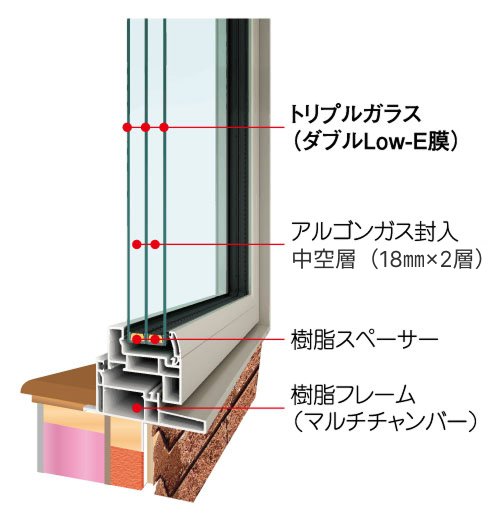 断熱性能の高い窓は外気の影響を受けにくいので、表面の温度が安定して結露が抑えられ、窓際でのヒンヤリ感もなくなります。エコットハウスは高性能トリプルガラスを採用しています。